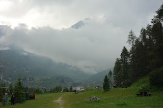 Poco después llegaba a Zermatt (1.600m; 13'5km; 4h), a mis espaldas se alzaba el Cervino, todavía con el pico cubierto por la niebla. Empezaba a pensar que no llegaría a verlo.
