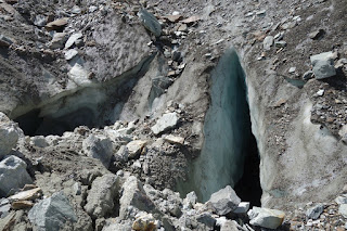 Las 2 horas siguientes fueron de lo mejor de todo el recorrido. Poco a poco me fuí adentrando en el glaciar y solo, sin encontrarme a nadie, entre unas montañas espectaculares, con un día espléndido, oyendo únicamente el discurrir de los arroyos que se formaban por el deshielo y corrían con fuerza, formando preciosas cuevas de un azul intenso, pensé que ya había merecido la pena... aunque todavía no había visto el Cervino.