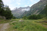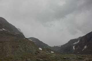 Hubo solo un trueno más y finalmente decidí continuar. Pronto empezó a llover con muchísima fuerza, incluso a granizar por breves momentos. Hay bastantes señales y además en el primer tramo únicamente hay que bajar y bajar, pero por una zona con muchas piedras que comenzaban a ponerse peligrosas con la lluvia. Llovía tanto que el gps resultaba de poca ayuda porque si conseguía limpiar las gafas apenas podía ver la pantalla... Esto me hizo pensar que cuando llegase al valle tenía que tener mucho cuidado de no equivocarme. Ya casi abajo hay una zona con escaleras metálicas y cuerdas pero no suponen una especial dificultad. Entonces vi un grupo de 4 personas al fondo y aceleré el paso hasta alcanzarlas. Conocían el camino al refugio, aunque no iban para allí, y eso me tranquilizó. El camino por el valle, con el cauce de un río a nuestra derecha, sigue transcurriendo por zonas pedregosas pero sin especial dificultad, salvo por la lluvia que obligaba a tener especial cuidado. Llegamos así a un punto en el que hay una señal que indica el refugio Prarayer atravesando por un prado en el que apenas se distinguía el camino, lo que me hizo dudar y pregunté a mis acompañantes si no sería mejor seguir hasta el lago Di Place Moulin, en donde ellos tenía el coche y luego continuar por el borde del mismo hasta el refugio. Me dijeron que ese camino era mucho más claro, pero que haría un rodeo importante. Finalmente me metí por el prado y pronto aparecieron algunas señalizaciones más, lo que me tranquilizó. Se atraviesan unas granjas y casetas para el ganado y después un camino hacia la izquierda nos lleva hasta el refugio, en la cabecera del lago (2.010m; 20'5km; 8h).