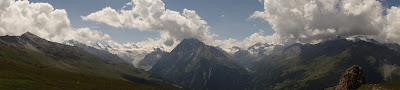 No tenía tiempo para subir, pero vi que después de una primera subida había una especie de planicie y decidí subir hasta allí. Es menos de media hora, con bastante pendiente, y se llega a una zona llana, a 2.620m, desde donde tienes el pico al alcance de la mano. Allí estuve un largo rato sin ser capaz de marcharme. Hay un banco en el que me tumbé sin dejar de mirar al pico. Vi alguna avioneta que lo rodeaba, aparecieron pequeñas nubes que lo cubrían hasta hacerlo invisible para enseguida dejarlo de nuevo al descubierto, y también en algún momento resultaba imposible no traer a la mente la conocida imagen del logotipo de Toblerone; y si mirabas a cualquier otro lado tenías una imagen de los Alpes difícil de olvidar.