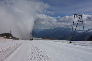 Al poco de comenzar a caminar me dí cuenta de que en realidad no era tan difícil, solamente tenía que descender siguiendo la pista de esquí hasta la altura del refugio y luego continuar por debajo de los telesillas, casi en línea recta. Desde luego en absoluto eran necesarios grampones y la única dificultad era evitar pequeños arroyos que se formaban por el deshielo y que a veces obligaban a separarse un poco de las torretas de los telesillas. Esto podría ser un problema con niebla, pero ese día toda estaba en el entorno de la cima del Cervino, que impedía contemplarlo, pero en la zona en la que caminaba lucía el sol y el cielo estaba totalmente despejado.