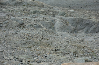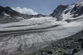 El camino gira a la derecha y al poco se desciende y tendremos en frente el final del Alto Glaciar de Arolla.