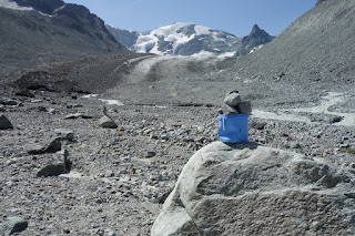 Finalizando la pendiente más fuerte me encontré una marmota que corría a su madriguera y poco después una pequeña laguna, Beplan Gouille (2.520m; 8'2km;3h), el sitio perfecto para refrescar los pies y comer una fruta. Se estaba bien allí y me paré un buen rato disfrutando del lugar. Cuando ya me iba me crucé con una chica que subía con un bebé de pocos días, seguro que no meses, y me quedé pensando si era muy decidida o muy imprudente, aunque desde luego iba bien preparada, con una buena mochila para el niño y un gran paraguas que parecía especialmente diseñado para repeler lo rayos ultravioletas.