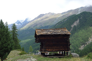 Se llega así al final del glaciar, en la zona de Trockener Steg (2.939m; 14km; 1:15h). Poco después comienza el descenso hacia Zermatt, siguiendo las indicaciones de Furggy y Furi. Al poco de iniciar el descenso de nuevo comenzó a llover de manera muy intensa. No saqué el anorak pensando que duraría poco, pero enseguida lo que caía era granizo, con tal virulencia que llegaban a doler los impactos en la cara, así que tuve que ponerme el anorak y la capucha bien abrochada para proteger la cara. Fueron casi 2 horas de lluvia y de nuevo estaba empapado, pero en este caso, tras la lluvia de nuevo apareció el sol. Los jubilados marchaban delante de mi a un ritmo endiablado y así pronto llegamos a los primeros pueblos del valle. Hay varias opciones para llegar a Zermatt, yo elegí la que pasa por Zum See (1.720m, 11'3km; 3:30h), una aldea preciosa de casas de madera muy peculiares. Curiosamente también había una especie de hórreos, en versión suiza.