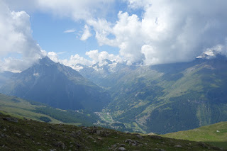En toda la subida apenas me había encontrado con media docena de personas. Pasé uno minutos disfrutando de las espectaculares vistas, que en días claros pueden alcanzar hasta el Mont Blanc. A mi espalda la presa de Moiry y Lac de Autannes y al frente, en el valle, las poblaciones de La Ville, La Sage y Les Audères. Por momentos la niebla cubría totalmente el valle, para descubrilo de nuevo en pocos segundos. Llegó entonces un grupo procedente del valle y el que parecía el guía, o el líder, no dejaba de dar voces animando a los que iban subiendo con mas dificultades. Era el momento de marcharse. Al poco de comenzar la bajada la niebla desapareció por completo y de nuevo lucía un sol radiante.