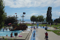 Hechas las compras dediqué el resto del día a callejear por la ciudad. Es bonita la zona monumental próxima a la catedral pero como hacía calor me fui hacia el lago, al agradable barrio de Ouchy. Después de un alto para disfrutar de una buena cerveza en el puerto, preparando la primera etapa del día siguiente, continuo hasta la zona de Bellerive. Allí hay un enorme complejo, con piscinas, tumbonas y todo lo necesario para disfrutar del sol y el lago... pero había bastante gente y no me apetecía pagar la entrada para estar solo un rato, así que me fui hacia el lago buscando donde darme un baño y enseguida me encontré una especie de chiringuito, Jetée de la compagnie, muy agradable, con mesas de madera a la sombra justo al borde del lago. Allí estuve un rato, bañándome, disfrutando del lugar... y hasta me permití un gintonic, por solo 4 €!!, claro que era versión suiza, un mini gintonic, pero estuvo bien.